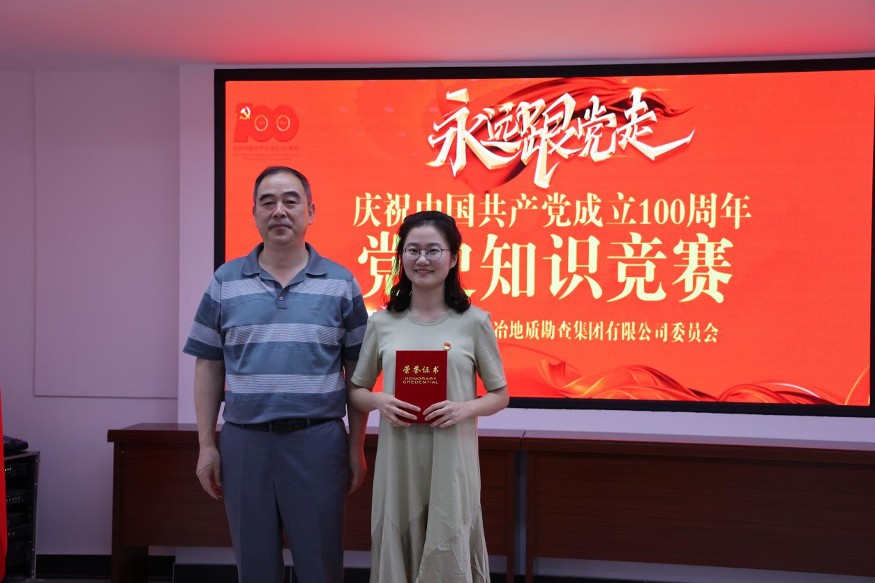 地勘集團(tuán)公司黨委書記、董事長金其軍為個人一等獎獲得者張瑤頒獎